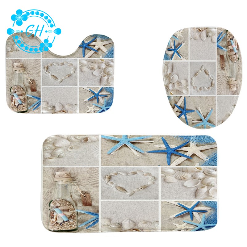 4pcs Summer Conch Starfish Mats Bath Mat Shower Curtain Lid Toilet
